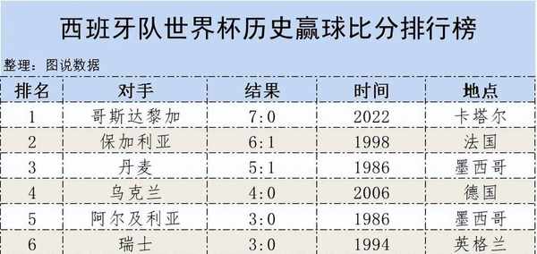 下面,我们一起看看西班牙队内世界杯历史最大赢球比分排名: