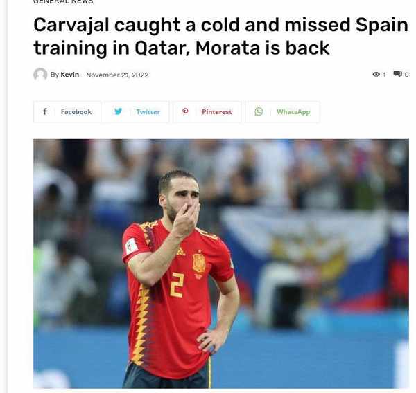 据悉,西班牙地方队世界杯赛事还没开打就遭遇了一个不大不小的打击,地方队7名球员遭遇了感冒的侵袭,其中多人出现了嗓子嘶哑等症状,前锋莫拉塔还因为感冒较重缺席了训练。