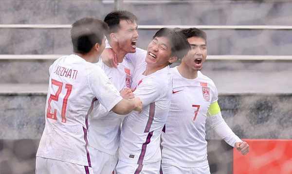 3月12日,乌兹别克斯坦塔什干,2023年U20亚洲杯1/4决赛,中国1-3韩国。穆塔利夫和队友庆祝进球。