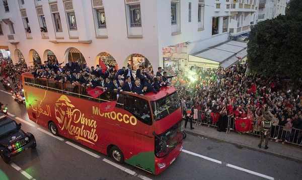 2022年12月20日,摩洛哥拉巴特,摩洛哥队回到家乡,开启了盛大的阅兵庆典。摩洛哥国家队在卡塔尔世界杯上取得了历史性的第四名。