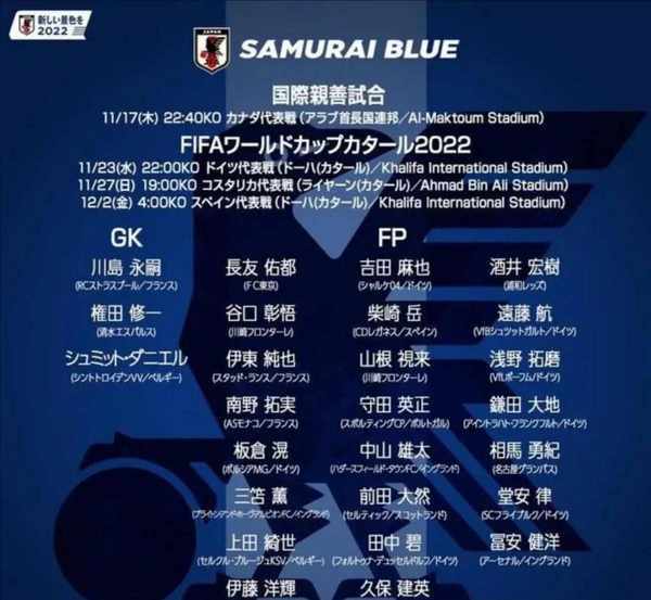 第四:国外旅欧球员分布广;有在欧洲五大主流联赛,英超,德甲,法甲,西甲。有在欧洲其它联赛,比甲,苏超,葡超等。比如较有名气的:川岛永嗣,吉田麻也,富安健洋、伊藤洋辉,久保建英,镰田大地,南野拓实等都是旅欧球员,从本届世界杯大名单里看,就涵盖20名旅欧球员,是本届赛事的不可动摇的主力。