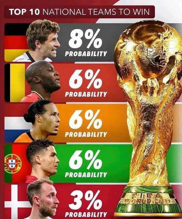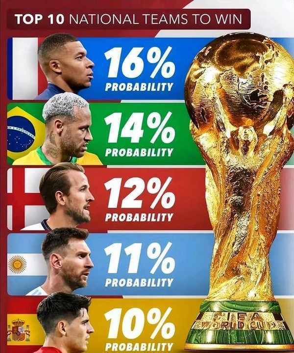 不知道最终冠军是否会产生在概率最高的这几支球队中?1、法国队16%2、巴西队14%3、英格兰12%4、阿根廷11%5、西班牙10%6、德国队8%7、比利时6%7、荷兰6%9、葡萄牙6%10、丹麦3%