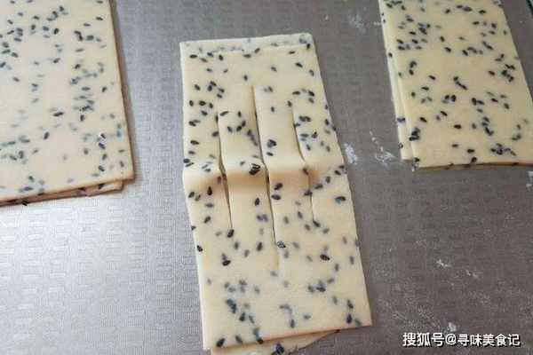 6、把两张面片重叠在一起,中间竖着切三刀,如图所示,注意力度要轻,两头不要切断,中间一道长一些,旁边两道短一点。