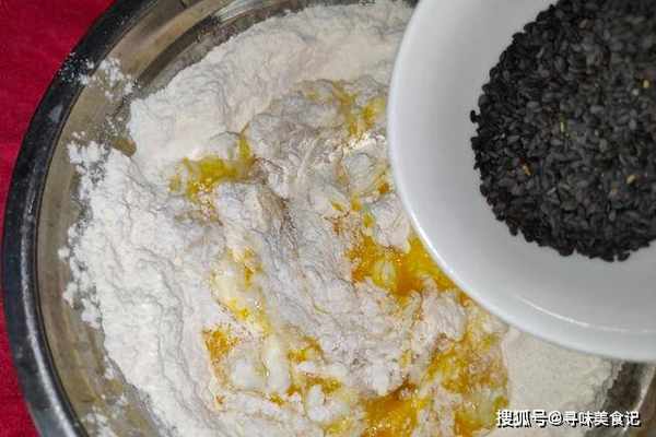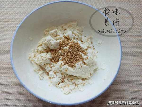 1、准备150克普通面粉,4克食盐,70克的清水和面,边倒边搅拌,等出现面絮后,加2勺白芝麻。