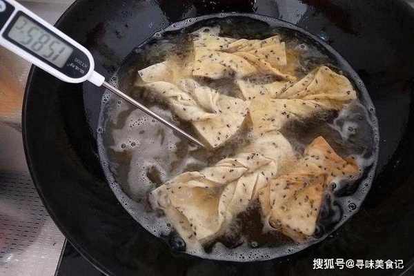 9、看好颜色,等炸成焦黄色,就能出锅了,麻叶很容易就能熟透,大约2-3分钟就可以。