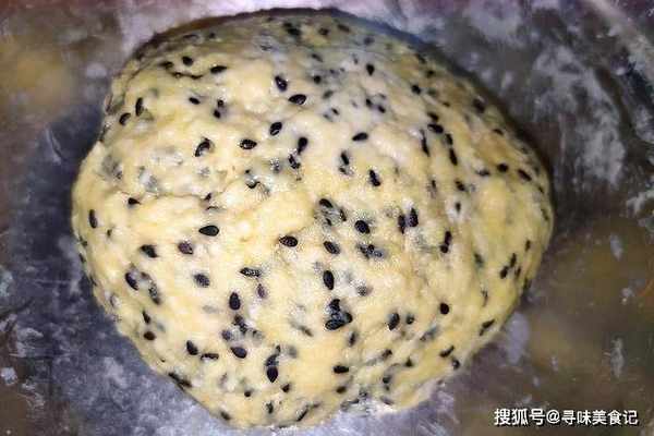 2、将芝麻搅匀,上手揉成一个光滑的面团,能达到面光、盆光、手光的状态就行,盖一层保鲜膜,饧面10分钟。