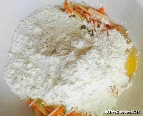 2、然后加入适量的面粉拌匀。面粉应该逐渐加入,直到它形成一个小球并且在油炸时不会散开。