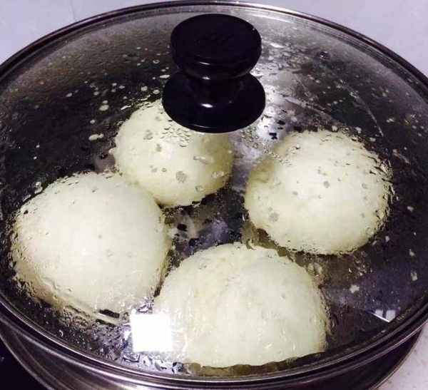 4、上锅冷水蒸。水开后,继续蒸15分钟,关火。关火后继续煮5分钟再出锅,以免馒头塌陷。