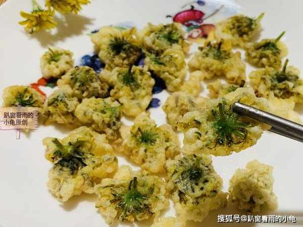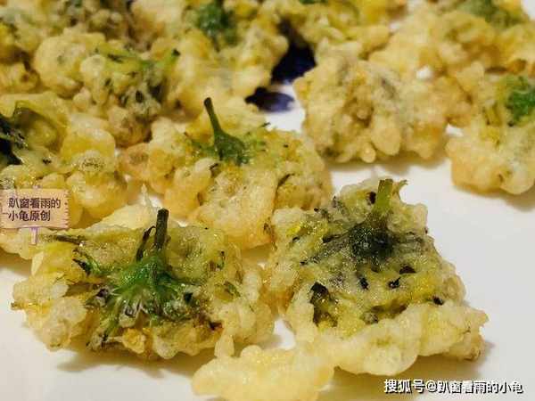 4、这时,你会发现,裹上面糊的蒲公英开始在油锅中“绽放了”,等定型后翻至另一面,煎炸至金黄色就可以控油装盘了。