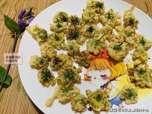 2、调面糊的时候最好不要太稠,因为蒲公英的花朵本身比较柔嫩,稍微裹上一层薄薄的面糊就可以了。