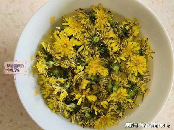 1、只将蒲公英的花朵部分摘下,不需要花茎,然后把蒲公英花在清水中冲洗几遍,再放入淡盐水中浸泡十分钟后控干水分备用。[此步注意:蒲公英花浸泡盐水的目的是去掉灰尘还有花朵里可能有的小虫子。]