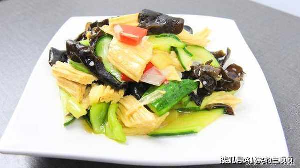 就可以出锅装盘。这道鲜香清脆的黄瓜木耳炒腐竹就做好了。
