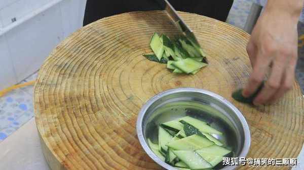 黄瓜一根,先切成斜刀段,再切成菱形片。
