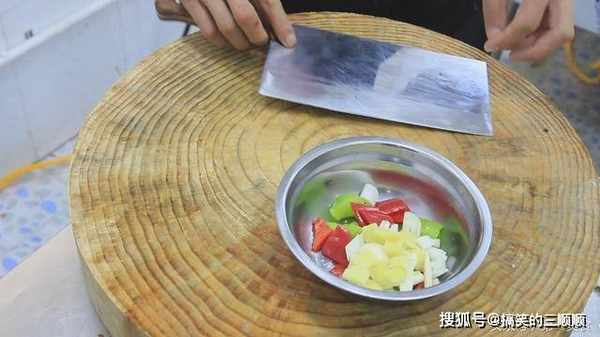 青椒和红椒各半片,分别切成菱形片,大葱破开切成葱花,大蒜切成蒜片,