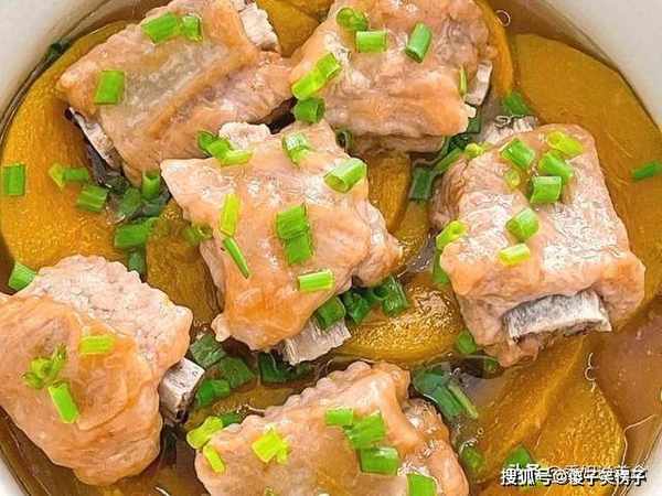 2、南瓜去皮后切成厚一点的片,摆放在盘子底部,再放入腌制好的排骨,水开上锅蒸30-40分钟。