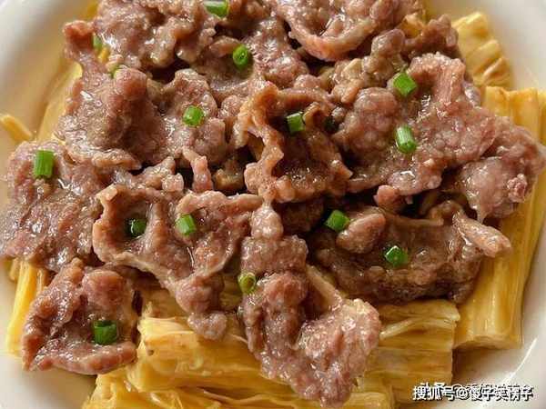 2、腐竹放入清水中浸泡,泡软后切成段,摆放在盘子底部,再铺上腌制好的牛肉,水开上锅蒸10分钟。
