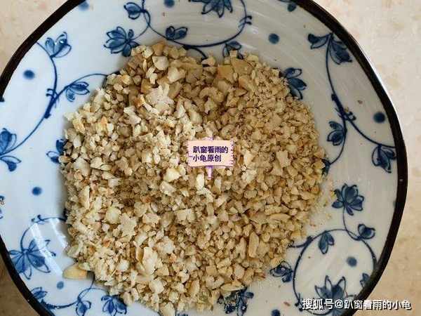 2:火上坐炒锅,倒入一小把花生,小火慢炒,待花生炒熟后将其晾凉,揉搓掉花生的外皮后,将花生仁装在保鲜袋中,放在案板上,用擀面杖擀成花生碎。[此步注意:花生碎不用擀得特别细,有些颗粒状最好。]