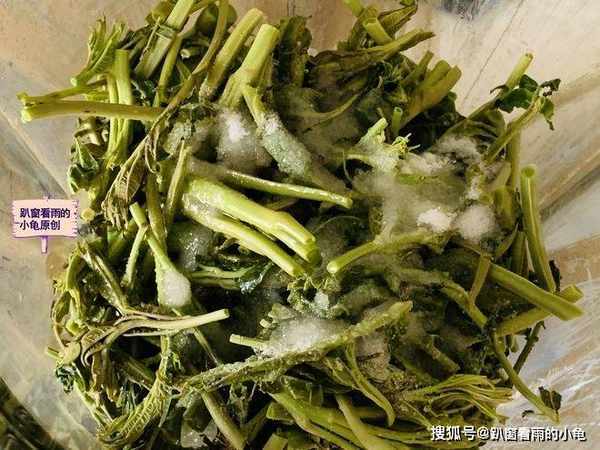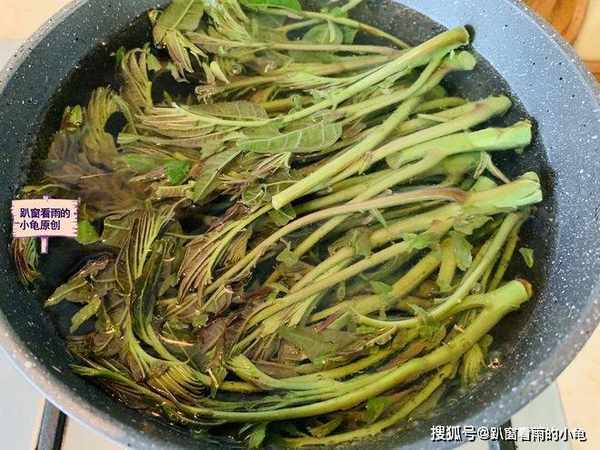 1:将香椿掰开、去掉干叶、剪掉最下面的老茎,用清水洗干净后,放入沸水中焯1-2分钟、香椿变成绿色后,捞出来过凉水,然后放置一旁控干水分。[此步注意:不要将香椿放在有太阳的地方晒干,而是将香椿放在阴凉处,将水分阴至八成干。]