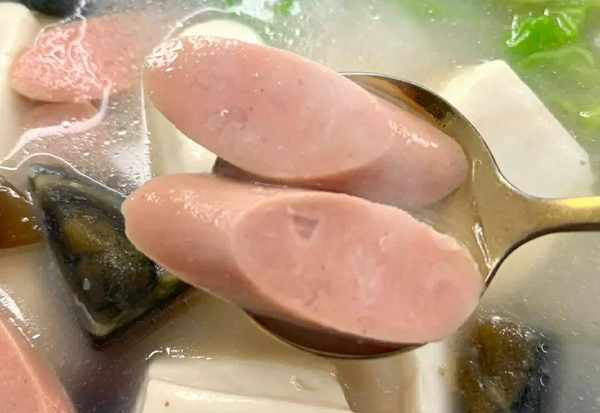 3.大火煮开以后,放入豆腐和火腿一起焖煮三分钟,再加入适量的食盐和鸡精调味提鲜,然后放入生菜烫熟,即可出锅开吃。