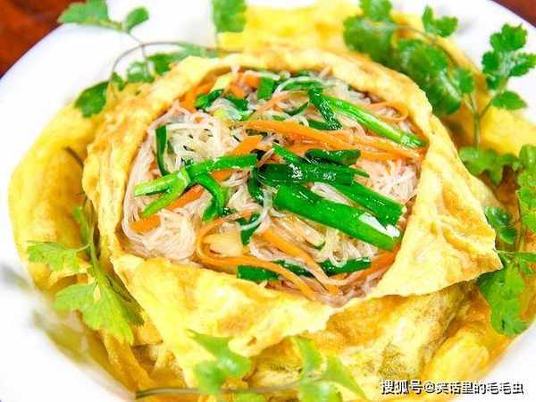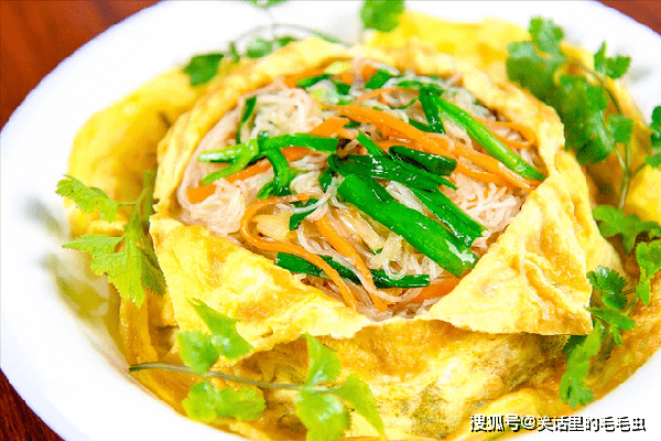 把炒好的什锦放入摊好的鸡蛋饼中,压上盘子,将碗倒扣过来,然后把碗拿掉。鸡蛋饼周围放几片香菜做装饰,在鸡蛋饼上划一个十字刀,将四个角翻开就做好了。