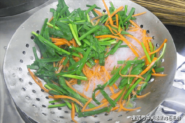,再放入韭菜和粉丝。翻一下,立即倒出。然后用凉水冲洗,以免粉丝坨在一起。