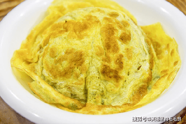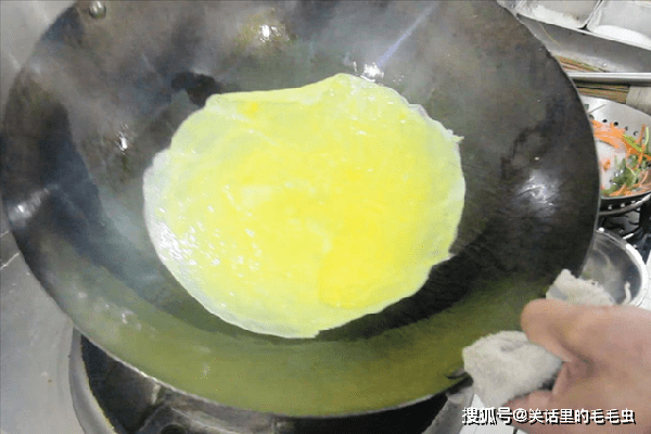 锅里烧油,倒入鸡蛋液。转动锅,让鸡蛋圈圈扩大,均匀的铺在锅底。在鸡蛋周围淋一点植物油,成型以后,翻过来。煎另一面,煎好后,将鸡蛋饼平放入碗中。