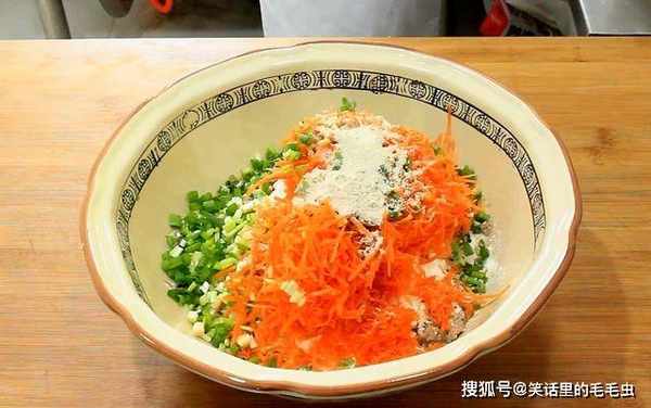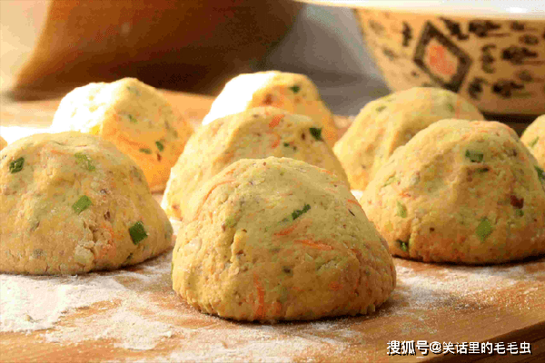 豆渣冷却后,加入一勺面粉、一勺玉米面,想要更营养的话再加点胡萝卜丝和葱花,放盐、鸡粉调味,再加入5克酵母和成面团,发酵至2倍大。