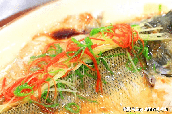 然后淋上蒸鱼豉油,撒点葱丝、姜丝、红椒丝配色增香,再激上200度热油美味即成。