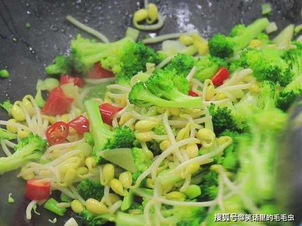 锅内烧油,倒入葱姜蒜和小米椒快速翻炒出香味,倒入黄豆芽翻炒1分钟左右。
