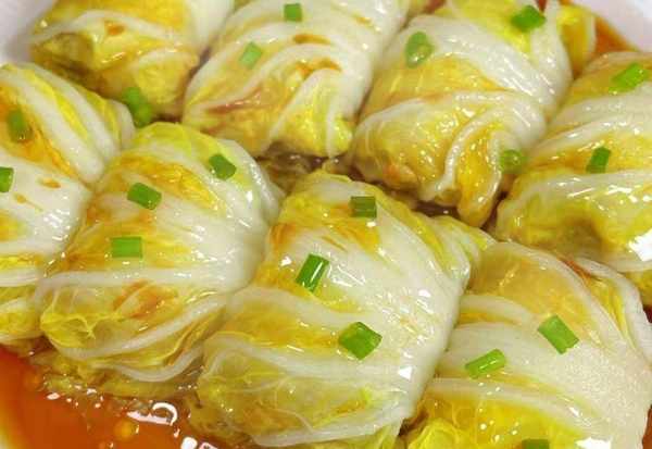 4、起锅烧水,水开后将白菜肉卷放上来蒸十五分钟,蒸熟之后取出来,淋上蒸鱼豉油,撒上葱花即可上桌开吃。