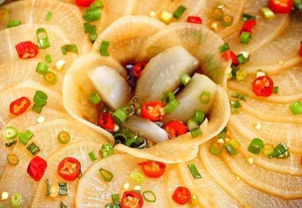 4、将酱汁倒入白萝卜中,就可以直接上桌开吃了。营养丰富,低脂低卡低热量。