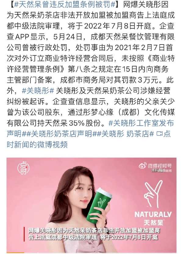 可以说,天然呆一出现就与关晓彤有着深刻的绑定关系。无论关晓彤与合作公司使用了怎样的障眼法,在消费者和加盟商的认知中,天然呆就是关晓彤的奶茶,因此打卡、加盟也都是冲着关晓彤而去。