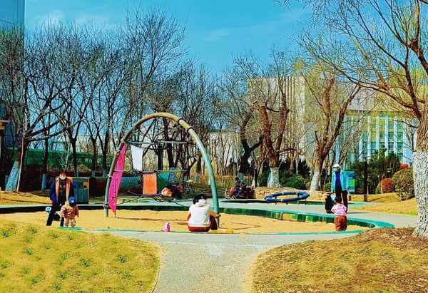 被第二社区中心、商业街和锦庐小区环抱的第二社区公园,拥有三个大小不一的沙坑及攀爬架、塑胶“山洞”等游乐设施,是孩子们家⻔口的“乐土”。