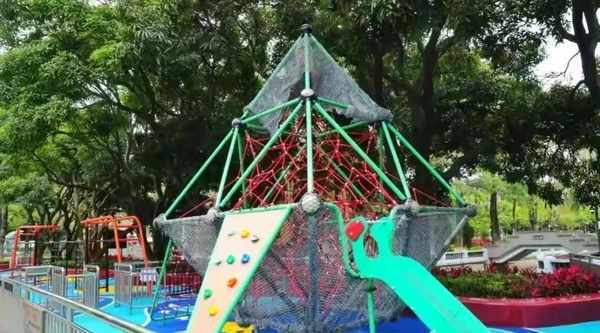 面积6585平方米,总有众多攀爬类和穿越设施,