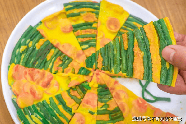 煮熟的豆角变得非常的软,像这样我们把豆角的首尾连接在一起,盘放在电饼铛里面。盘好之后,开小火、盖上锅盖烙2分钟。把豆角烙定型,然后在上面均匀淋上植物油。把面糊倒在豆角上面,铺平整。