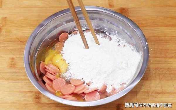 准备火腿两根,切成薄片,放入盆中。打入三个鸡蛋,加入食盐2克,鸡粉2克,十三香1克。再放入面粉50克,先把鸡蛋搅散,再搅入面粉,搅拌至没有面疙瘩。