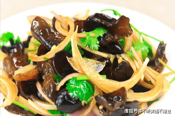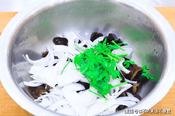 准备洋葱半个、切成片,和木耳放在一起,用手打散。