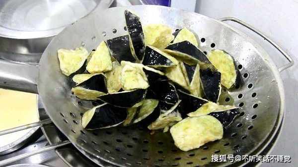 把茄子控水,撒上干淀粉,颠盆翻匀锅里烧油,油烧至5成,依次抓入茄子。开小火,慢慢地把茄子炸至金黄倒出控油。