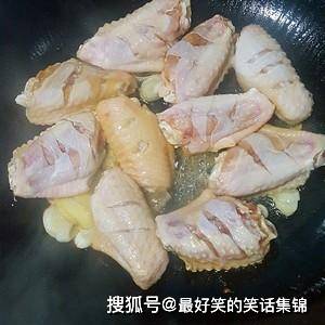 5、热锅凉油,放入葱姜,加入白糖。白糖融化后,倒入鸡翅,煎制。