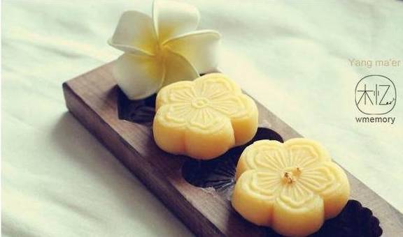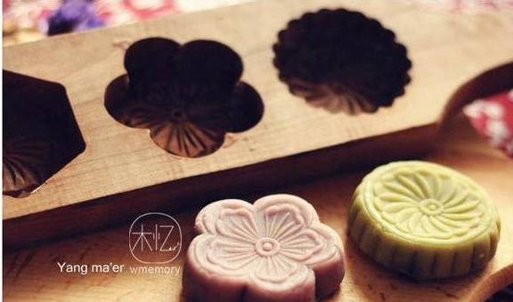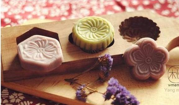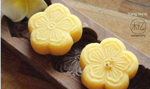 隔保鲜膜拧成球状,放入糕粉中滚一圈防粘,(注意要均匀的裹上,否则会粘住月饼模子)然后放入月饼模中压扁,脱模即可。