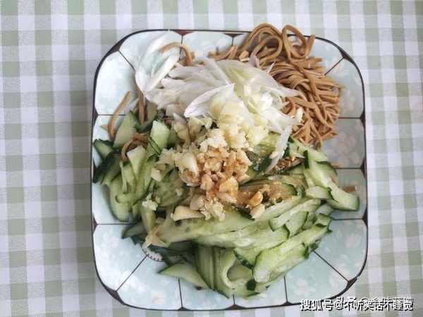 2、干豆腐丝中间断开,黄瓜切成丝,大蒜、葱切碎一些,均匀的铺在上面,根据自己的口味,加入盐、生抽、鸡精、醋、十三香。