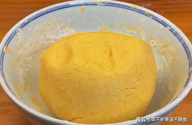 3、在南瓜泥上放糯米粉,放少许砂糖,搅拌均匀,变黄色面团。