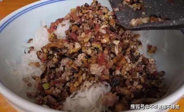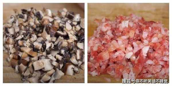2、香菇提前浸泡10分钟,洗净,切丁备用。猪肉也切丁备用。