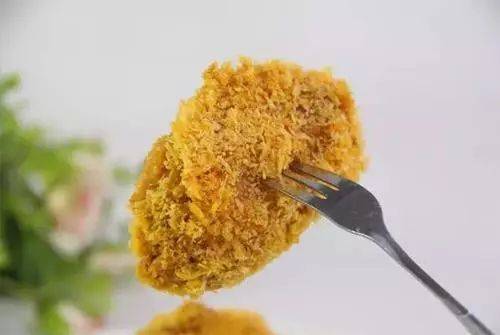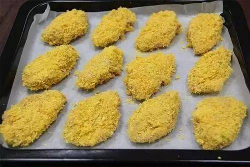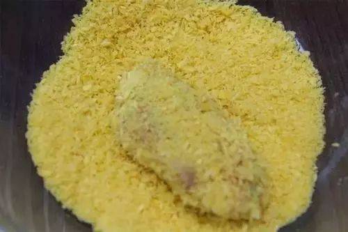 6.将腌制好的鸡翅在芝士里滚一圈,再裹上一层面包糠