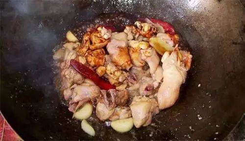 4.将鸡块放入锅中煸炒30秒左右