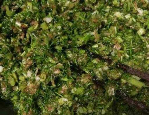 第五步:将腌制好的肉馅倒入茴香中,倒入适量的食用油、盐和香油拌匀成馅。