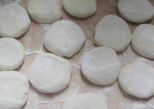 第六步:将发酵好的面团倒在烤盘上,揉成有弹性的面团,继续揉成长条状,将面团切成较大的面块。第七步:将面条擀成尽量薄的圆形面团,然后铺在案板上,倒入适量的茴香肉馅,最后将两边合拢成饼状。