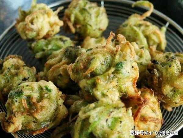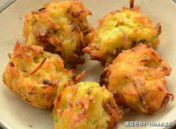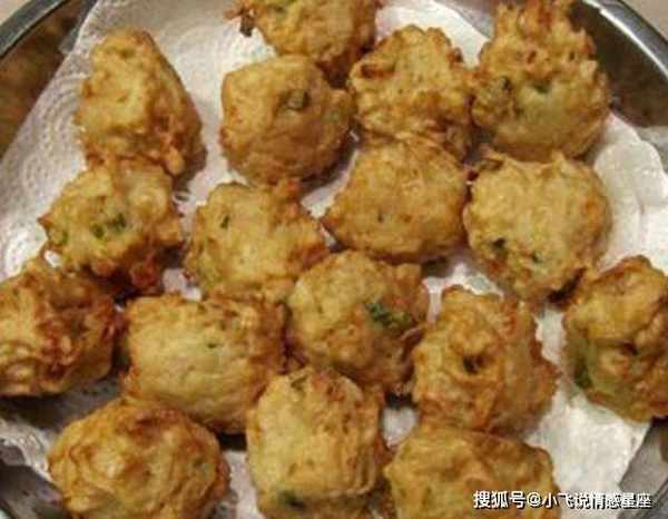 第六步:用勺子尽量圆一点,不需要用手捏成丸子,小火煎至丸子呈金黄色,捞出沾油食用。