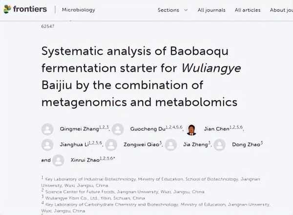 近日,五粮液联合江南大学团队对五粮液包包曲中微生物、酶系开展了系统研究,形成的科研论文《联合宏基因组和代谢组技术对五粮液包包曲进行系统性分析》(Systematic analysis of Baobaoqu fermentation starter for WuliangyeBaijiu by the combination of metagenomics and metabolomics)发表于国际微生物学刊物《微生物学前沿》(Frontiers in Microbiology,IF6.064, Q1)。