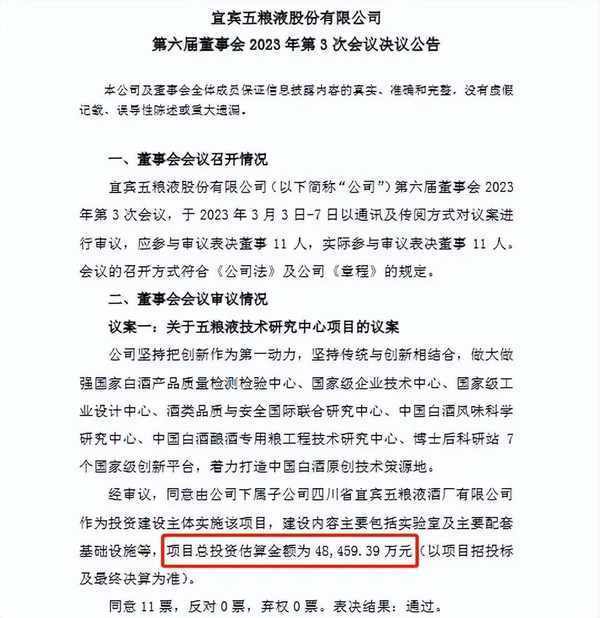 五粮液3月8日发布公告称,公司拟由下属子公司四川省宜宾五粮液酒厂有限公司作为投资建设主体,建设五粮液技术研究中心项目,建设内容主要包括实验室及主要配套基础设施等,项目总投资估算金额为48459.39万元,约4.85亿元。